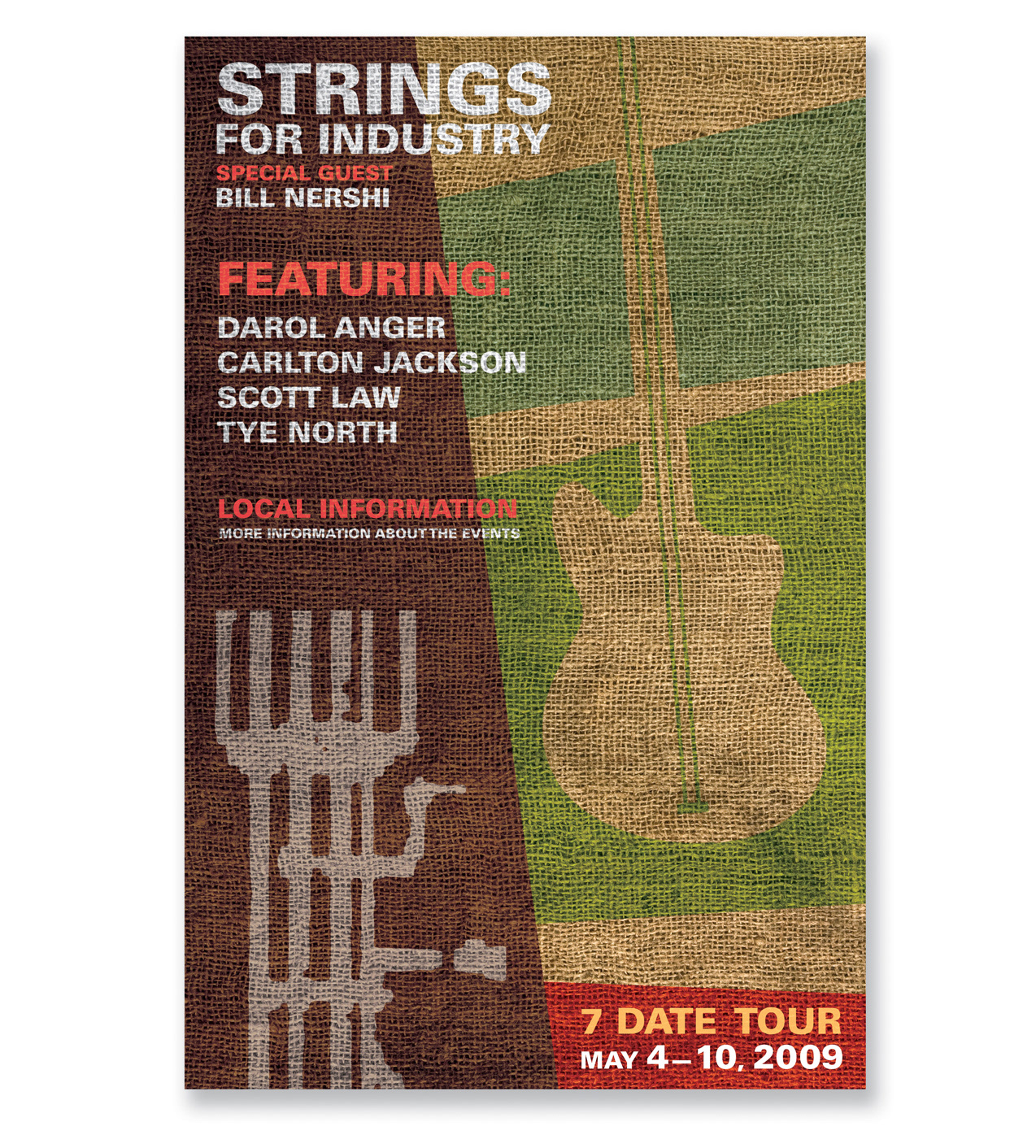 Poster concept for Strings For Industry; a bluegrass band. A rustic design that brought out the character of the band and the music they perform.